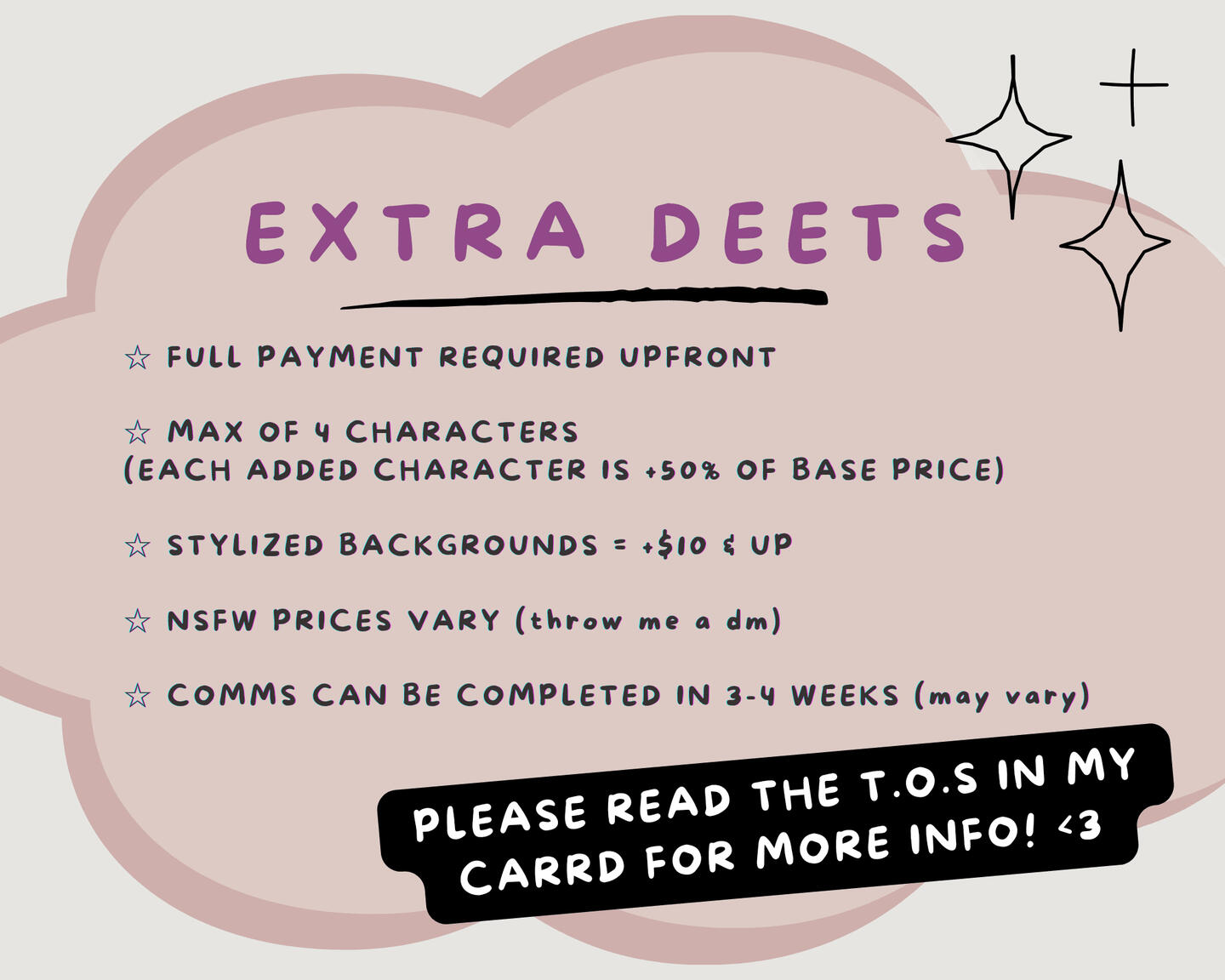 I may share completed commissions on social media. Please discuss with me beforehand if you are not comfortable with this!